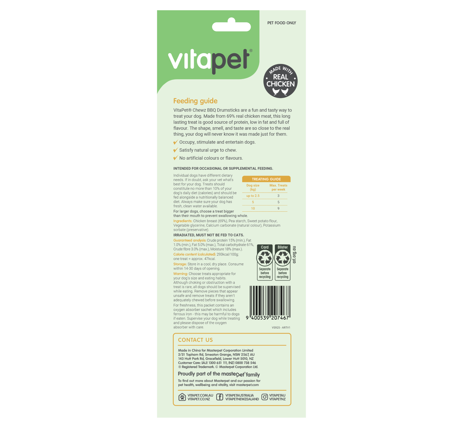 VitaPet Chewz BBQ Drumsticks are a fun and tasty way to treat your dog. Made from 69% real chicken meat, these long lasting treats are a good source of protein, low in fat and full of flavour. The shape, smell, and taste are so close to the real thing, your dog will never know it was made just for them.
