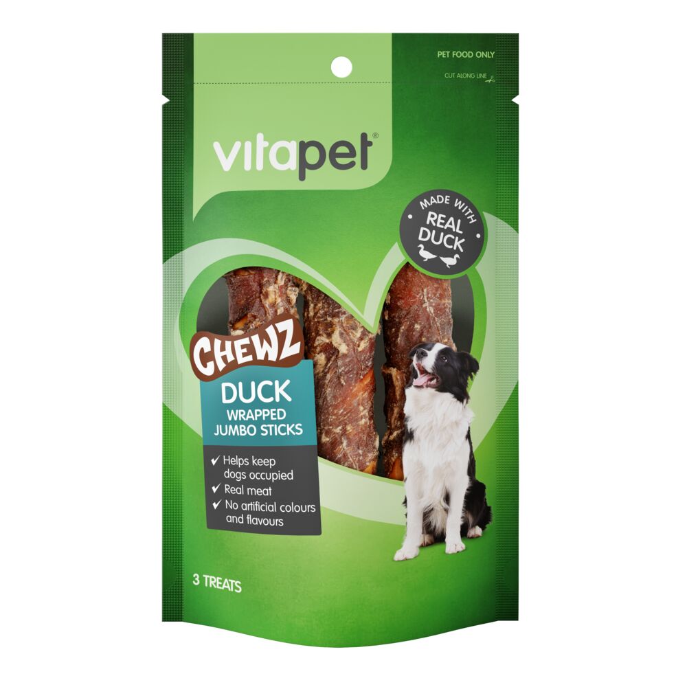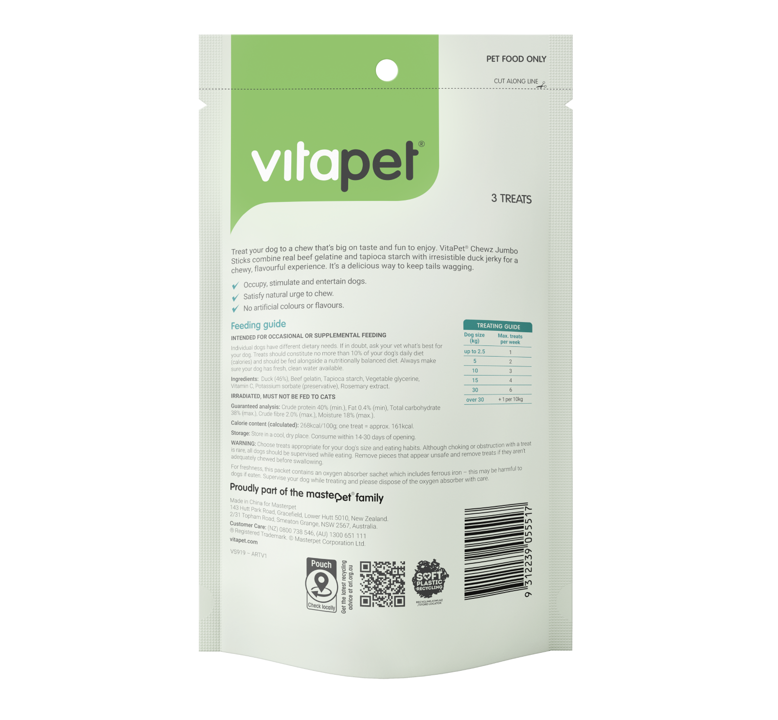 Treat your dog to a chew that's big on taste and fun to enjoy. VitaPet Chewz Duck Wrapped Jumbo Sticks combine real beef gelatine and tapioca starch with irresistible chicken jerky for a chewy flavourful experience. It's a delicious way to keep tails wagging.
