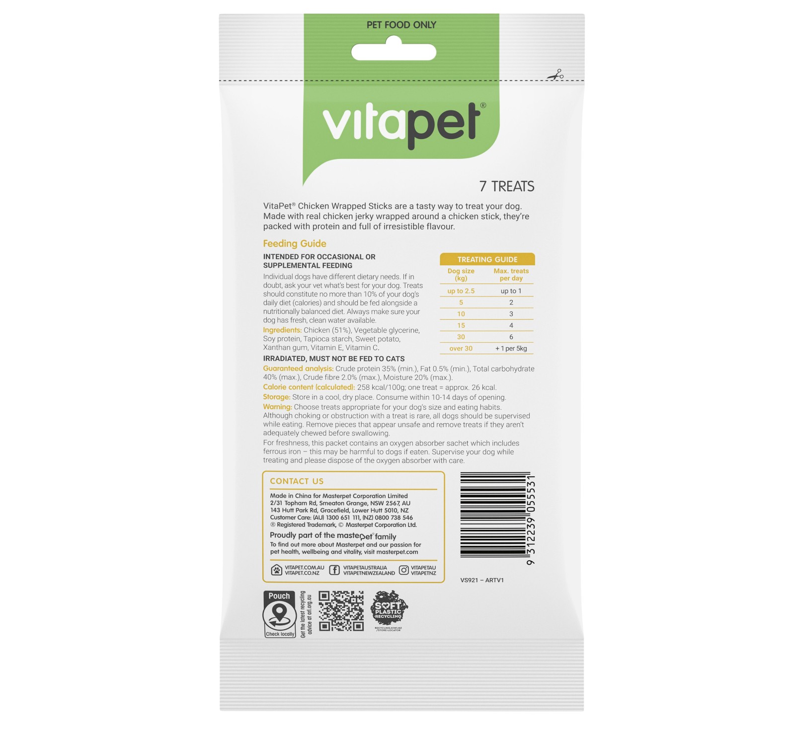 | Calorie content (calculated): | 258kcal/100g; one treat = approx. 26kcal |